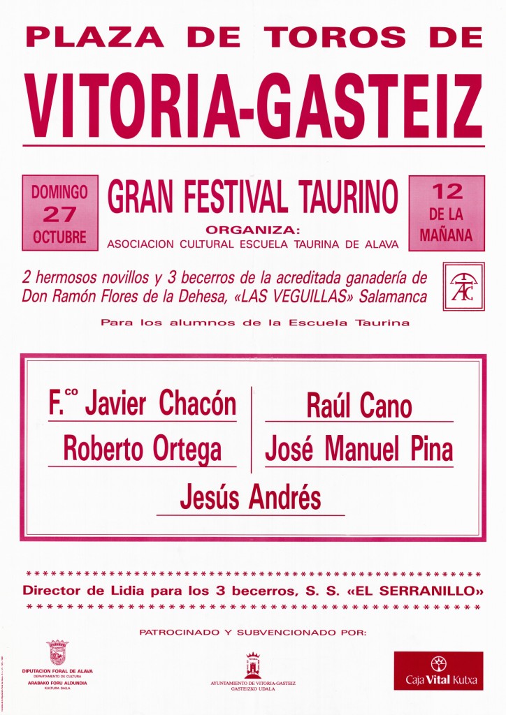 | Título: | Plaza de Toros de Vitoria-Gasteiz [Material gráfico] : gran festival taurino domingo 27 octubre : 2 hermosos novillos y 3 becerros : Fco. Javier Chacón, Roberto Ortega, Raúl Cano, José Manuel Pina, Jesús Andrés... |