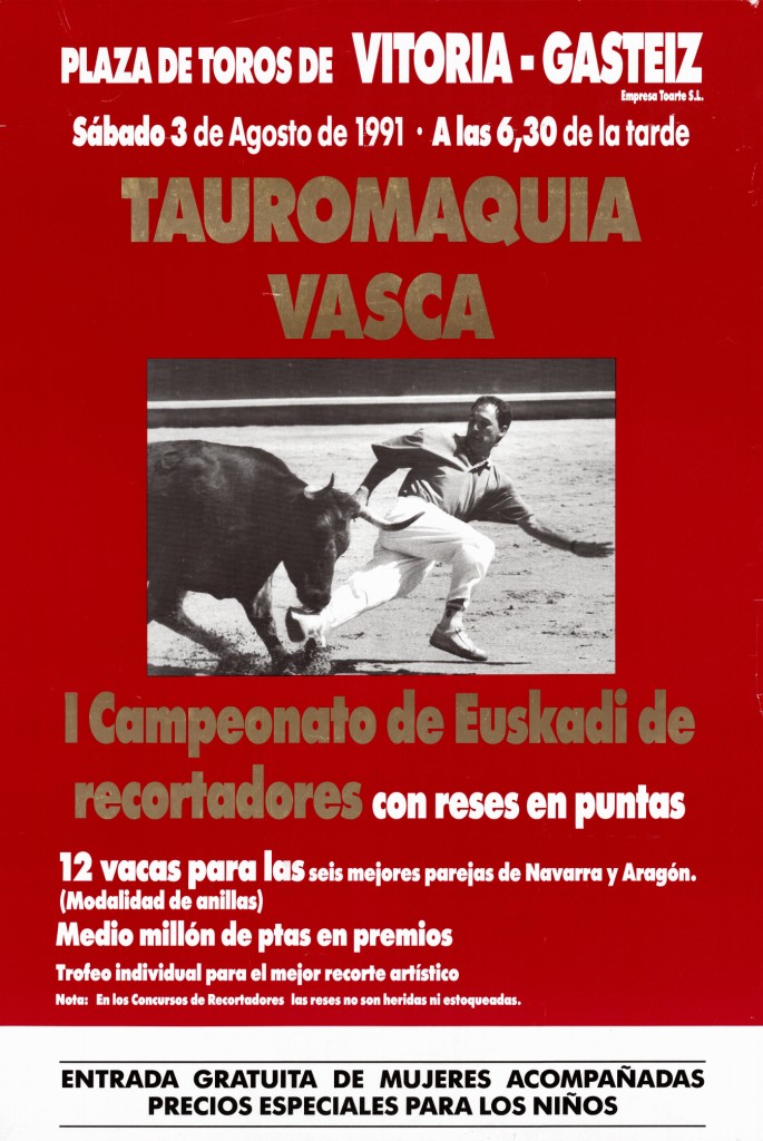 Título: Tauromaquia vasca [Material gráfico] : Plaza de Toros de Vitoria-Gasteiz : sábado 3 de agosto de 1991 : I Campeonato de Euskadi de Recortadores con reses en puntas