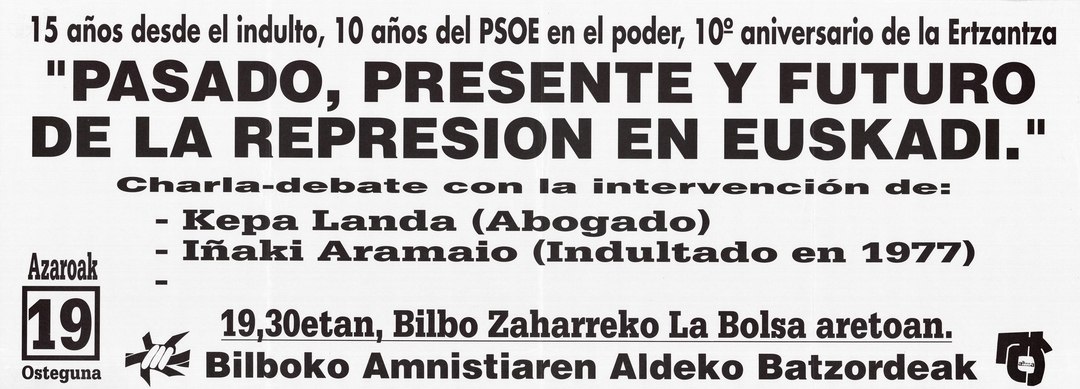 | Izenburua: | 15 años desde el indulto, 10 años del PSOE en el poder, 10. aniversario de la Ertzantza [Material gráfico] : "Pasado, presente y futuro de la represión en Euskadi" charla-debate con la intervención de, Kepa Landa (abogado), Iñaki Aramaio (indultado en 1977) : azaroak 19 osteguna |
