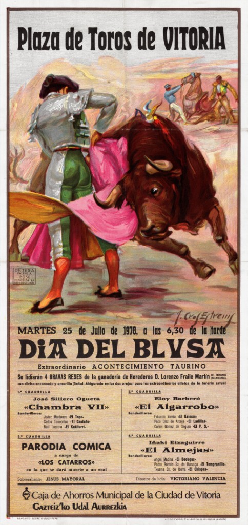 Izenburua: Plaza de Toros de Vitoria... martes 25 de julio... día del Blusa... extraordinario acontecimiento taurino, 4 bravas reses... [Material gráfico] : José Sillero Ogueta "Chambra VII", Eloy Barberó "El Algarrobo", Parodía Cómica "Los Catarros"...