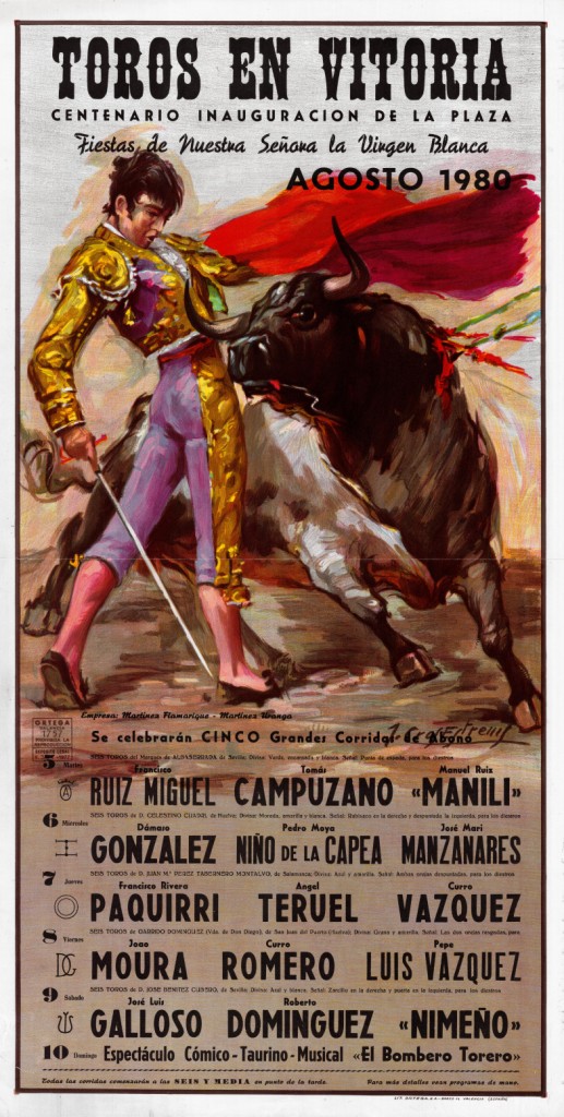 | Izenburua: | Toros en Vitoria [Material gráfico] : centenario inauguración de la plaza : fiestas de Nuestra Señora la Virgen Blanca : agosto 1980 : se celebrarán cinco grandes corridas de abono |