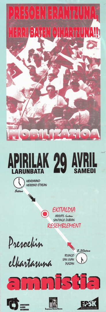 Título: Presoen erantzuna herri baten oihartzuna!! [Material gráfico] : mobilizazioa apirilak 29 avril [sic] : amnistia
