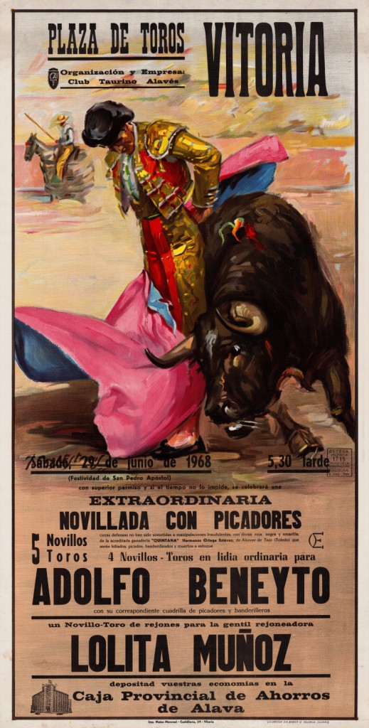 Título: Plaza de Toros Vitoria [Material gráfico] : 29 de junio, extrordinaria novillada con picadores : 5 novillos- toros, 4 novillos toros en lidía ordinaria para Adolfo Beneito y un novillo-toro para la rejoneadora Lolita Muñoz