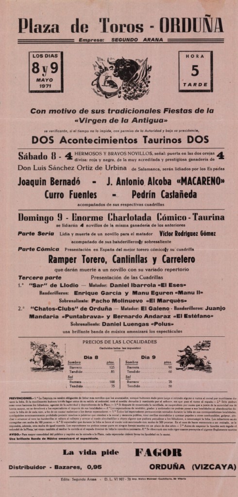Izenburua: Plaza de Toros-Orduña [Material gráfico] : los días 8 y 9 mayo 1971 : con motivo de sus tradcionales fiestas de la Virgen de la Antigua : dos acontecimientos taurinos dos