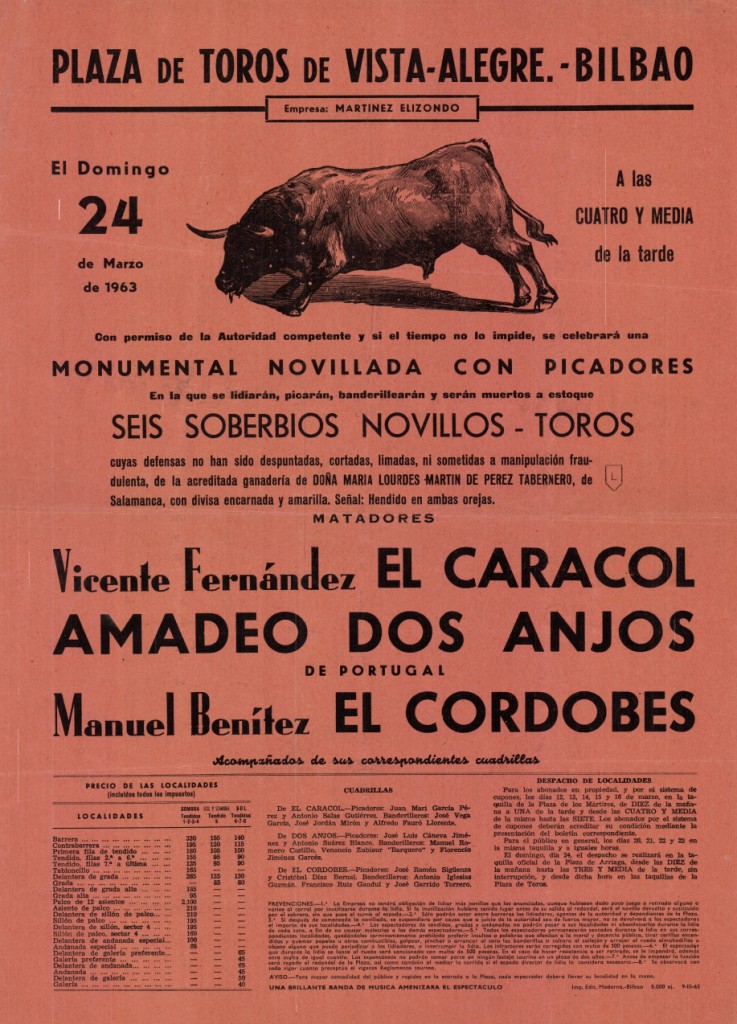 Título: Plaza de Toros de Vista Alegre, Bilbao [Material gráfico] : monumental novillada con picadores... : seis soberbios novillos-toros : El Caracol, Amadeo Dos Sanjos, El Cordobés