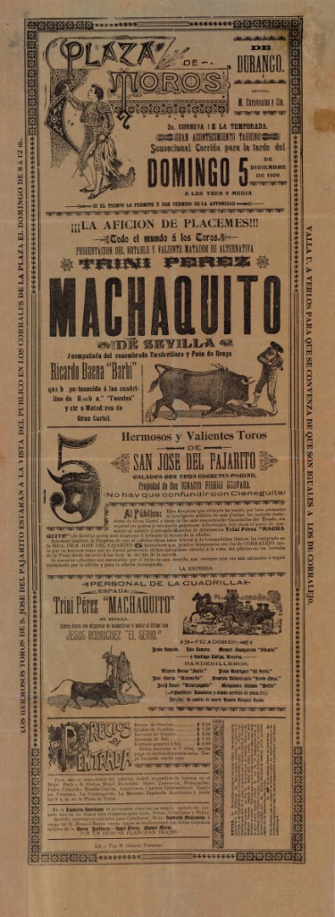 Título: Plaza de Toros de Durango [Material gráfico] : domingo 5 de diciembre de 1909 : Trini Pérez Machaquito de Sevilla... hermosos y valientes toros de San José del Pajarito