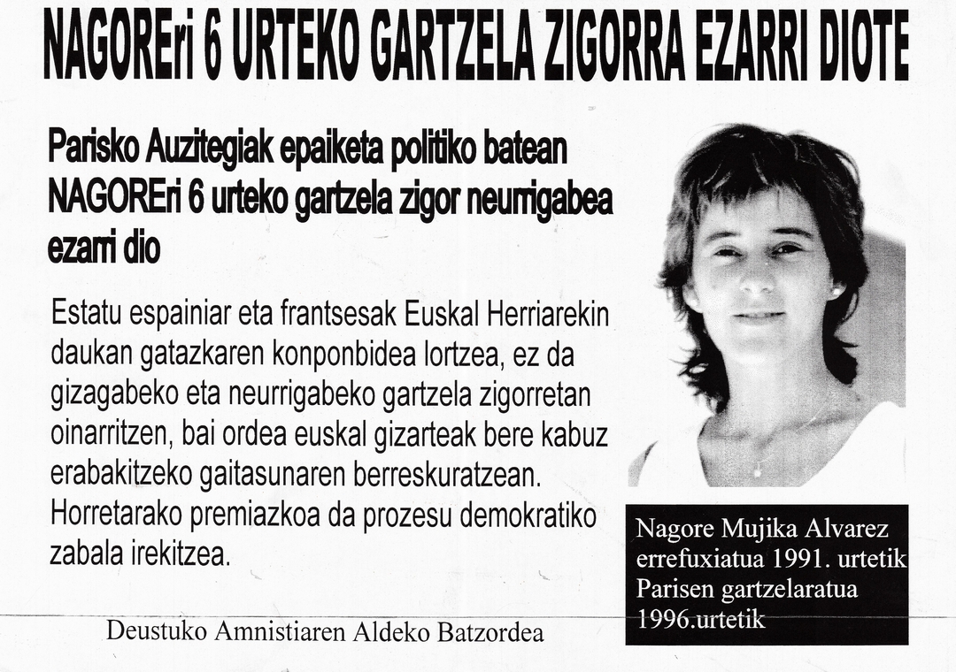 Título: Nagoreri 6 urteko gartzela zigorra ezarri diote [Material gráfico] : Nagore Mujika Álvarez errefuxiatua 1991 urtetik Parisen gartzelaratua 1996 urtera