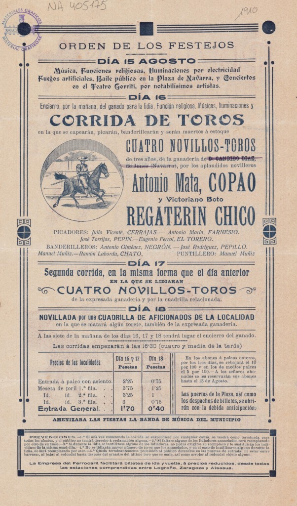 Título: Plaza de Toros Tafalla [Material gráfico] : fiestas y toros, solemnes y variadas funciones... cívico-religiosas : días 15 al 18 de agosto : tres corridas, dos de novillos-toros y una de toretes : Antonio Mata "Copao", Víctoriano Boto "Regaterín Chico"
