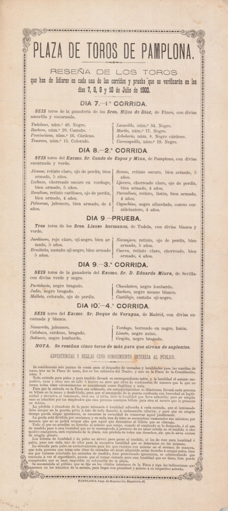 Izenburua: Plaza de Toros de Pamplona [Material gráfico] : reseña de Los toros, días 7, 8, 9 y 10 de julio : ganaderías, Sres. Hijos de Díaz, Conde de Espoz y Mina, Sres. Lizaso hermanos, Eduardo Miura, Duque de Veragua