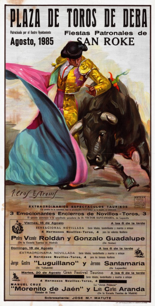 Título: Plaza de Toros de Deba [Material gráfico] : agosto, 1985, fietas patronales de San Roque : tres grandes acontecimientos taurinos, días 16, 18 y 20 : P.V. Roldán, González Guadalupe, J. Santamaría, Jorge Castro Luguillano, "Morenito de Jaén", L.C. Aranda