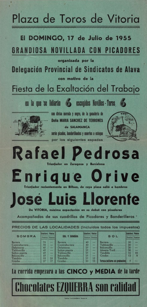 Título: Plaza de Toros de Vitoria [Material gráfico] : el domingo, 17 de julio de 1955 grandiosa novillada con picadores organizada por la Delegación Provincial de Sindicatos de Álava con motivo de la Fiesta de la Exaltación del Trabajo en la que se lidiarán 6 escogidos novillos-toros 6 con divisa morada y negra, de la ganadería de Doña María Sánchez de Terrones... para los siguientes espadas, Rafael Pedrosa, Enrique Orive, José Luis Llorente... acompañados de sus cuadrillas de picadores y banderilleros