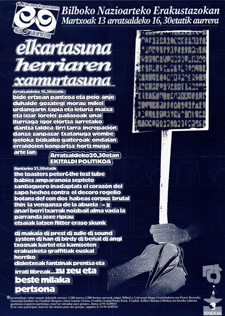 Título: Elkartasun eguna 99 [Material gráfico] : Bilboko nazio arteko erakustazokan martxoak 13 arratsaldeko 16:30etatik aurrera elkartasuna herriaren xamurtasuna