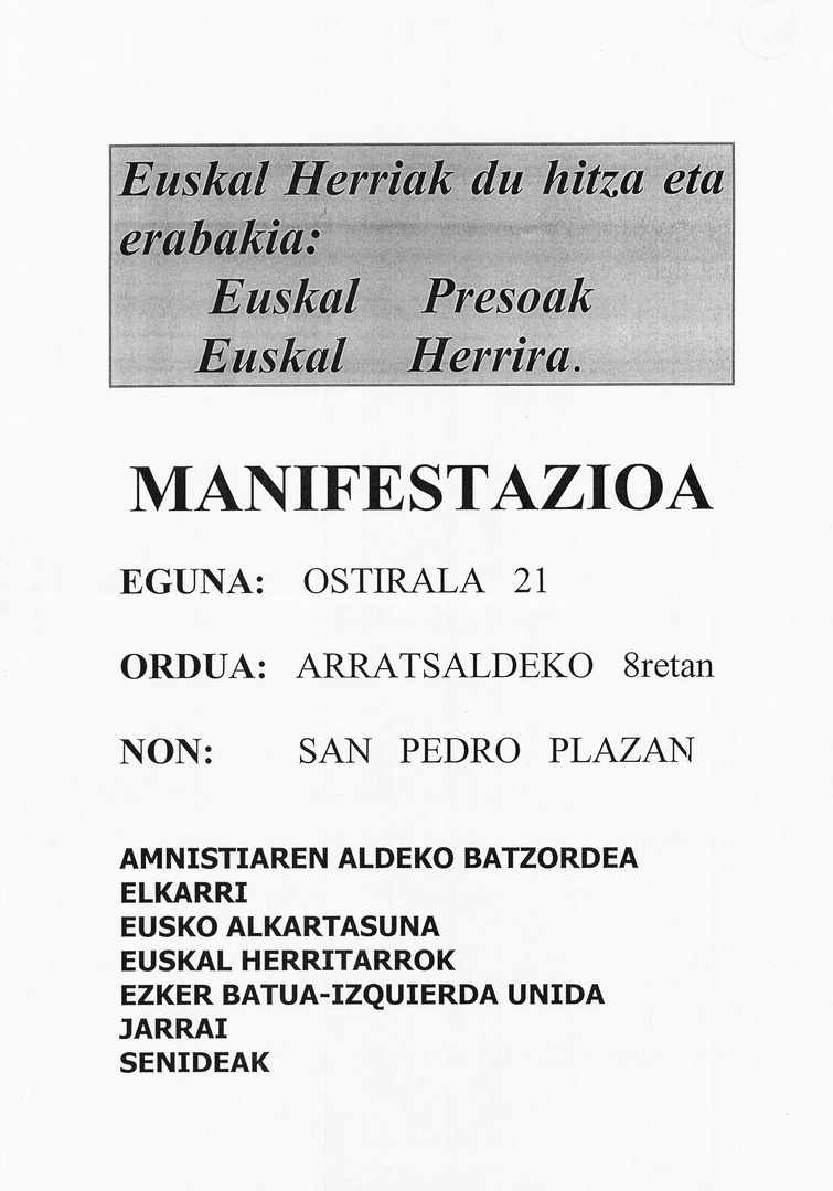 Izenburua: Euskal Herriak du hitza eta erabakia [Material gráfico] : euskal presoak Euskal Herrira : manifestazioa ostirala 21