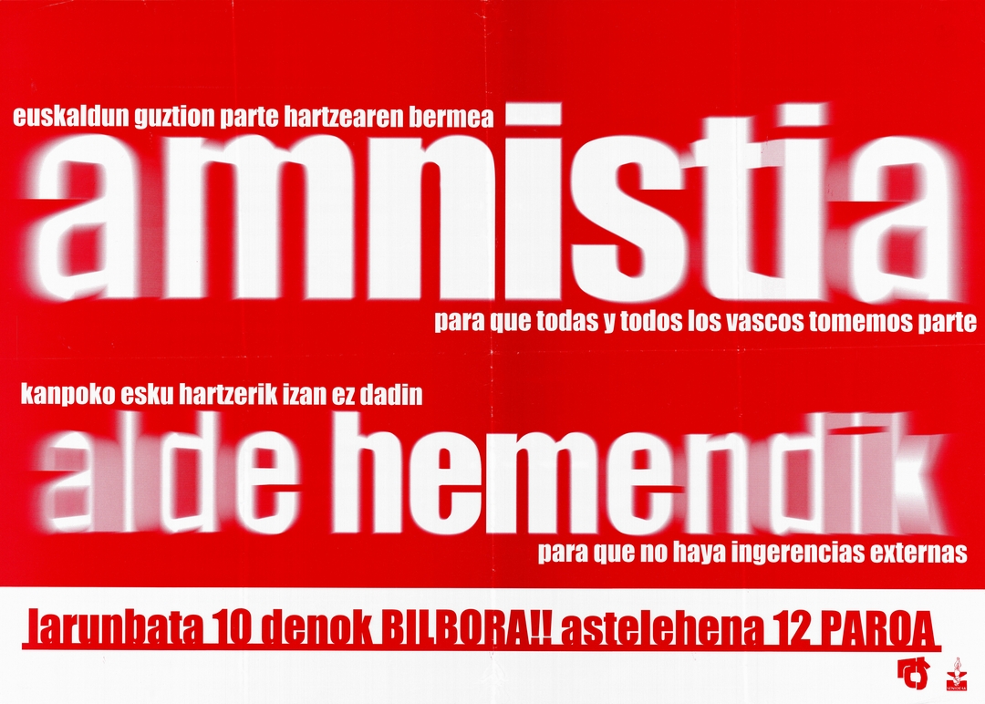 Título: Euskaldun guztion parte hartzearen bermea amnistia [Material gráfico] : kanpoko esku hartzerik izan ez dadin alde hemendik : larunbata 10 denok Bilbora! : astelehena 12 paroa = Para que todas y todos los vascos tomemos parte : para que no haya ingerencias externas