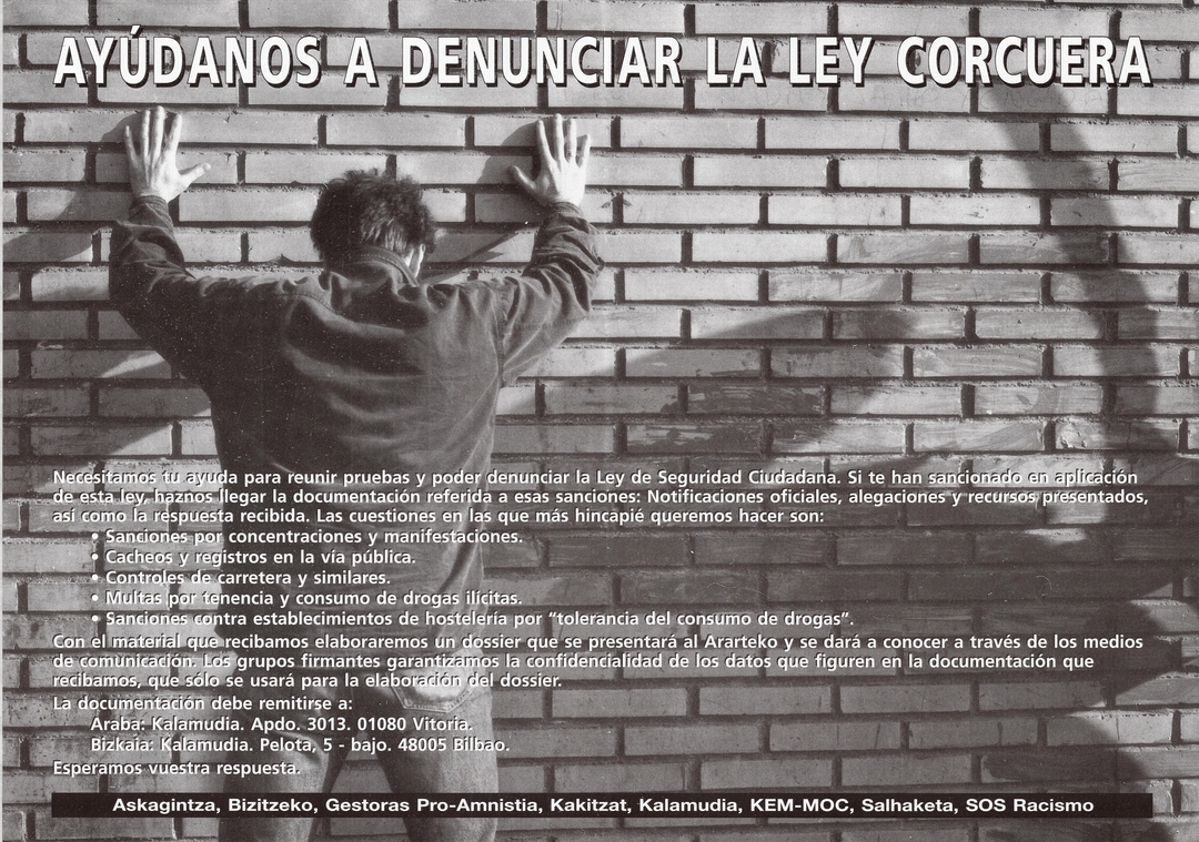 Título: Ayúdanos a denunciar la Ley Corcuera [Material gráfico]
