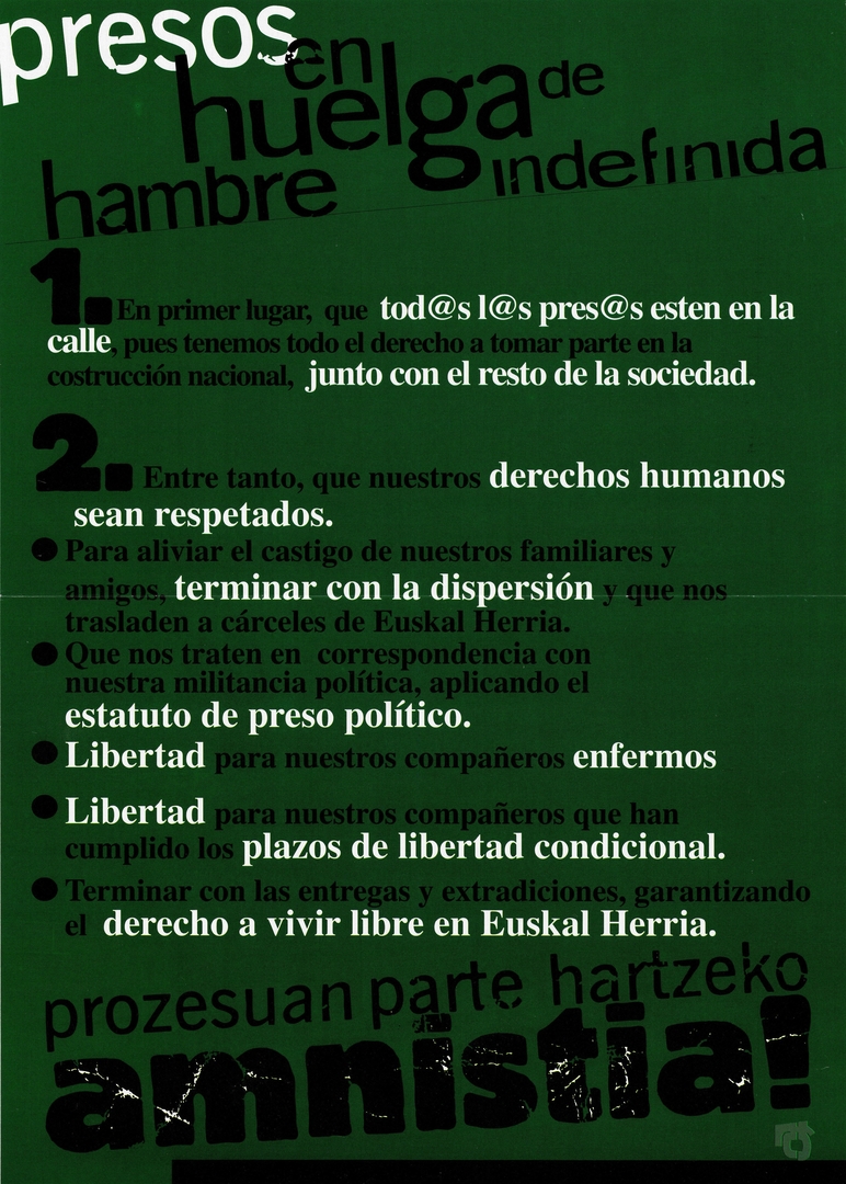 Izenburua: Presos en huelga de hambre indefinida [Material gráfico] 1. en primer lugar que tod@s l@s pres@s estén en la calle... : 2. entre tanto, que nuestros derechos humanos sean respetados... : prozesuan parte hartzeko amnistia!