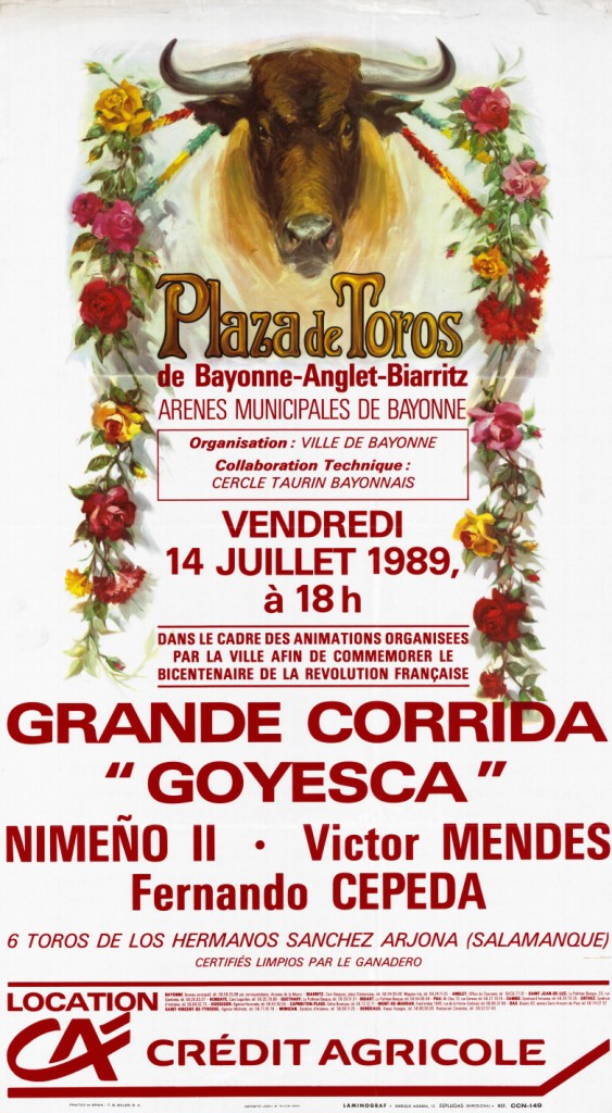 | Resumen: | Texto en Castellano y francés Ganaderia Hnos. Sánchez Arjona. Ilustración de la cabeza de unmorlaco adornado por unas orlas de flores. Conmemoración del segundo centenario de la revolución francesa. Anuncio publicitario en la parte inferior. Colabaration Cercle Taurin Bayonnais |