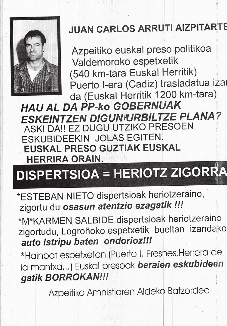 Título: Juan Carlos Arruti Aizpitarte [sic] [Material gráfico] : Azpitiko euskal preso politikoa Valdemoro expetxetik... : hau al da PP-ko gobernuak eskeintzen digun hurbiltze plana? : dispertsioa = heriotz zigorra : Estaben Nieto... : Ma. Karmen Salbide...