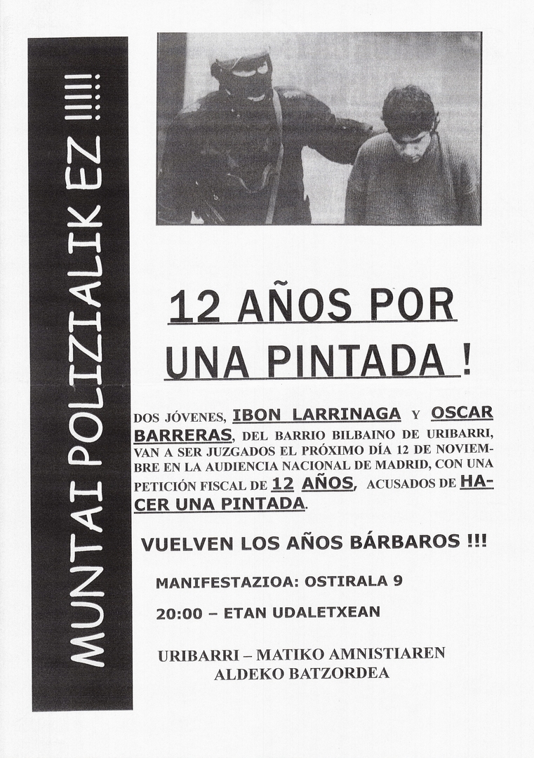 Título: Muntai polizialik ez! [Material gráfico] : 12 años por una pintada! : dos jóvenes, Ibon Larrinaga y Oscar Barreras del barrio bilbaíno de Uribarri van a ser juzgados el próximo 12 de noviembre... : vuelven los años bárbaros!!!