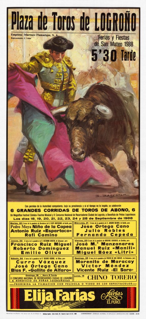 | Deskribapena: | Buen estado. Fondo A. Lafuente. Ilustración: Torero de gris y oro con montera, dando un pase con las dos manos. Destaca la empresa vasca Martínez Flamarique y la Ganadería bilbaína de Da. Dolores Aguirre. Torea entre otros, el Niño de la Capea. |