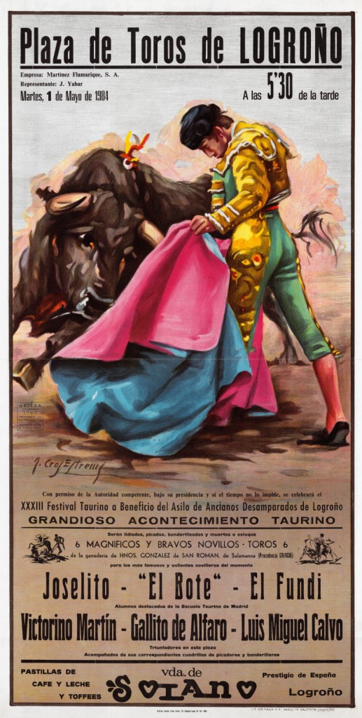 Deskribapena: Fondo A. Lafuente. Destaca la empresa vasca Martínez Flamarique. Torean, Joselito, "El Bote" y El Fundi, entre otros. Ilustración: torero con montera en verde y oro, dando un pase.