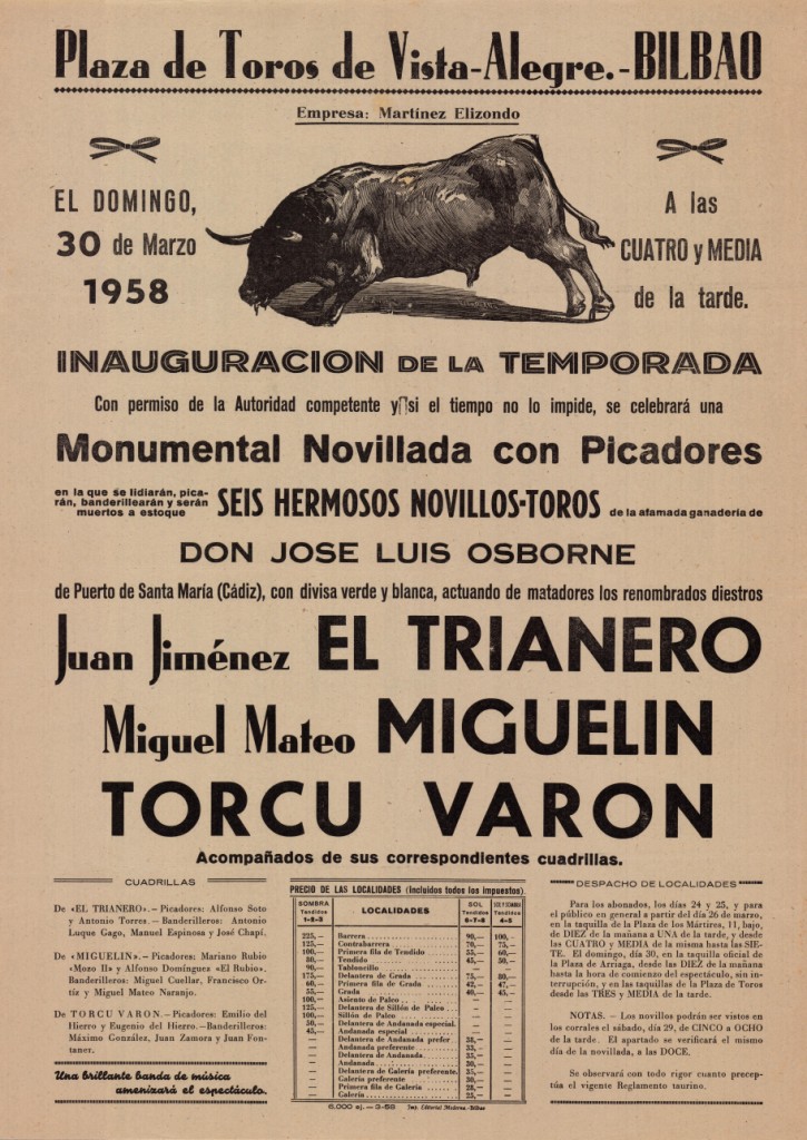 | Deskribapena: | Fondo A. Lafuente. Destaca la empresa vasca Martínez Elizondo. Torean Juan Jiménez "El Trianero", Miguel Mateo "Miguelín" y Torcu Varón. Ganadería de D. José Luis Osborne. Buen estado. |