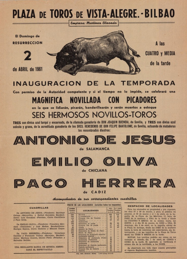 | Deskribapena: | Buen estado. Fondo A. Lafuente.. Destaca la Empresa Vasca Martínez Elizondo. Torean Antonio de Jesús, Emilio Oliva y Paco Herrera. Ganadería de D Joaquín Buendía y de los Srs. Herederos de D Felipe Bartolomé. |