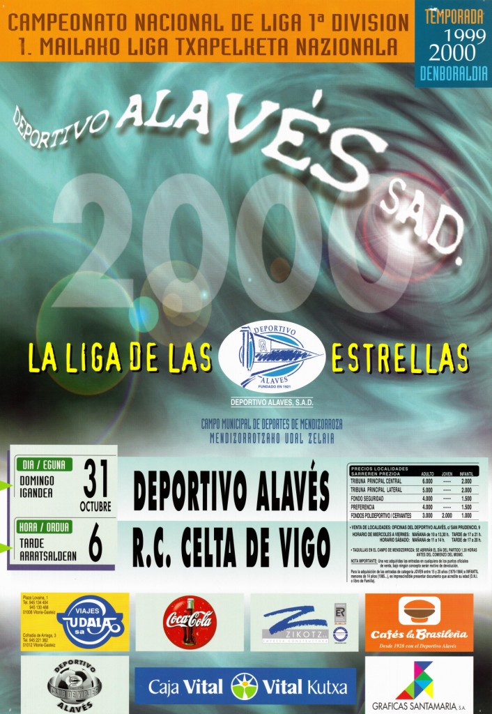 | Izenburua: | Campeonato Nacional de Liga 1a División [Material gráfico] : temporada 1999-2000 : Deportivo Alavés SAD. 2000 La Liga de las Estrellas : Deportivo Alavés - R.C. Celta de Vigo : domingo día 31 octubre, hora 6 tarde : Campo Municipal de Deportes de Mendizorroza = 1. Mailako Liga Txapelketa Nazionala : 1999-2000 denboraldia : eguna igandea 31, ordua 6 arratsaldean : Mendizorrotzako Udal Zelaia |