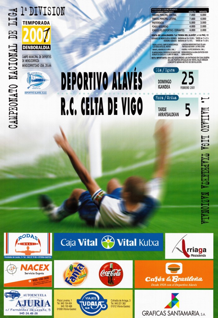 | Izenburua: | Campeonato Nacional de Liga 1a División [Material gráfico] : temporada 2000-2001 : Deportivo Alavés - R.C. Celta de Vigo : domingo día 25 febrero 2001, hora 5 tarde : Campo Municipal de Deportes de Mendizorroza = 1. Mailako Liga Txapelketa Nazionala : 2000-2001 denboraldia : igandea 2001eko otsailaren 25a, ordua 5 arratsaldean : Mendizorrotzako Udal Zelaia |
