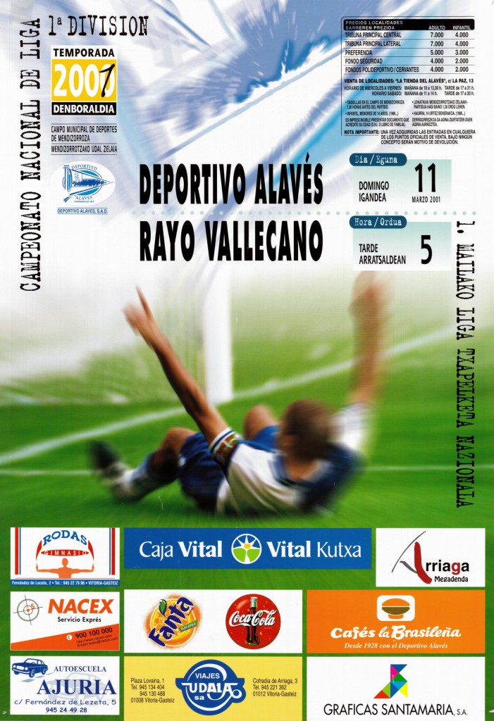 | Título: | Campeonato Nacional de Liga 1a División [Material gráfico] : temporada 2000-2001 : Deportivo Alavés - Rayo Vallecano : domingo día 11 marzo 2001, hora 5 tarde : Campo Municipal de Deportes de Mendizorroza = 1. Mailako Liga Txapelketa Nazionala : 2000-2001 denboraldia : igandea 2001eko martxoaren 11a, ordua 5 arratsaldean : Mendizorrotzako Udal Zelaia |