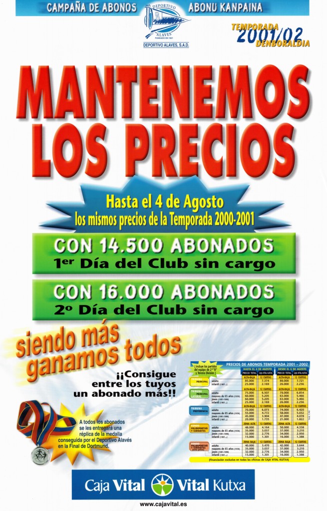 Título: Mantenemos los precios [Material gráfico] : campaña de abonos Deportivo Alavés temporada 2001-02 = abonu kanpaina 2001-02 denboraldia