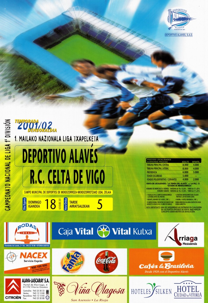| Título: | Campeonato Nacional de Liga 1a División [Material gráfico] : temporada 2001-2002 : Deportivo Alavés - R.C. Celta de Vigo : domingo día 18 noviembre 2001, hora 5 tarde : Campo Municipal de Deportes de Mendizorroza = 1. Mailako Nazionala Liga Txapelketa : 2001-2002 denboraldia : eguna igandea 18, ordua 5 arratsaldean : Mendizorrotzako Udal Zelaia |
