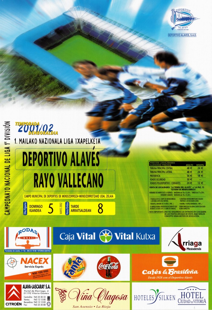Título: Campeonato Nacional de Liga 1a División [Material gráfico] : temporada 2001-2002 : Deportivo Alavés - Rayo Vallecano : domingo día 5 mayo 2002, hora 8 tarde : Campo Municipal de Deportes de Mendizorroza = 1. Mailako Nazionala Liga Txapelketa : 2001-2002 denboraldia : eguna igandea 5, ordua 8 arratsaldean : Mendizorrotzako Udal Zelaia