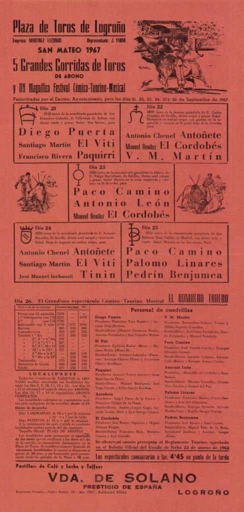 | Deskribapena: | Fondo A. Lafuente. Destaca la presencia de la empresa del vasco Martínez Elizondo. Torean: Diego Puerta, Santiago Martín "el Viti", Paquirri, Antonio Chenel " Antoñete", El Cordobés y V. M. Martín, entre otros. Buen estado, aunque unpoco roto en la parte superior derecha. |