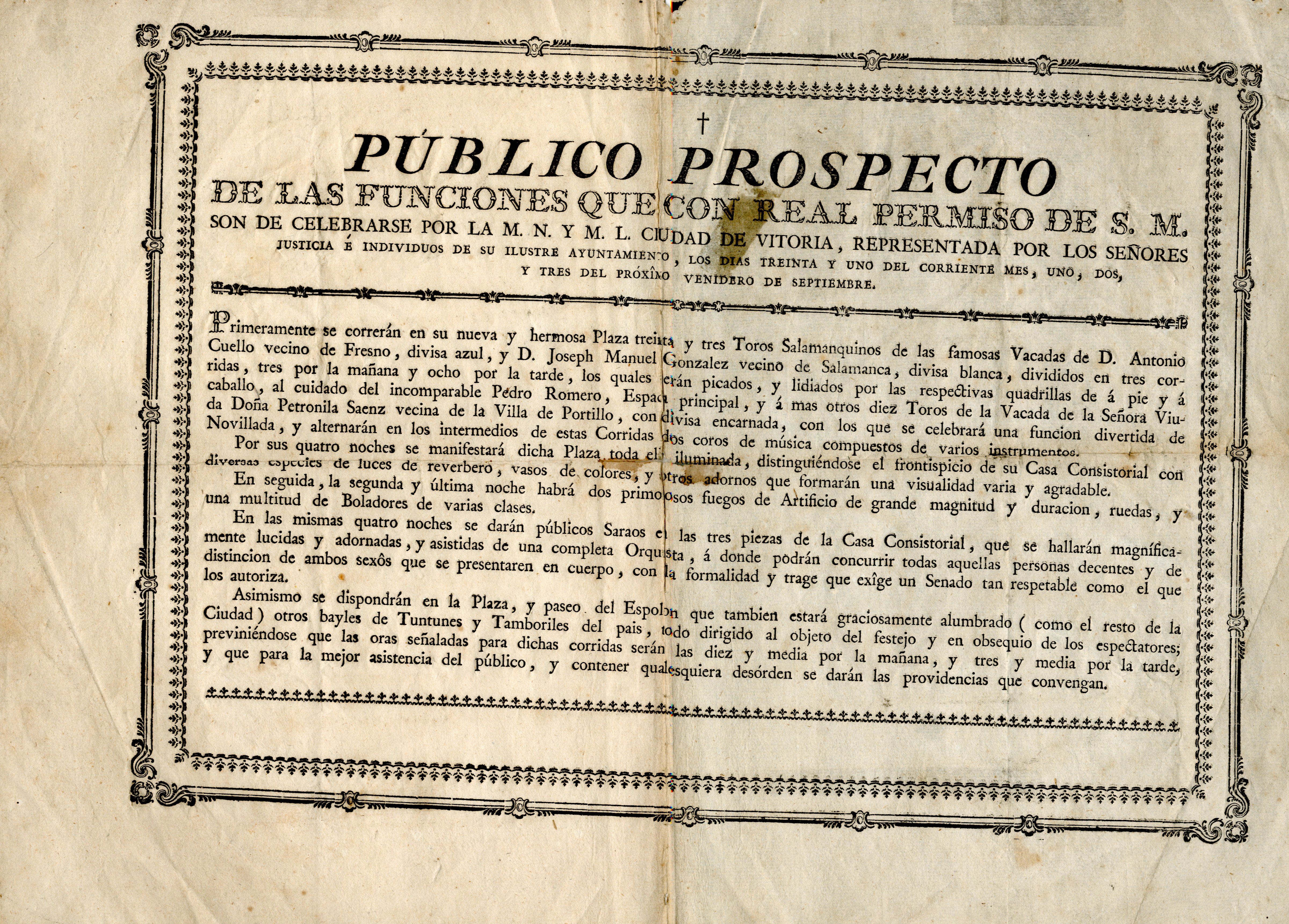 | Izenburua: | Público prospecto [Material gráfico] : de las funciones que con real permiso de S.M. son de celebrarse por la M.N. y M.L. Ciudad de Vitoria ..., los días treinta y uno del corriente mes, uno, dos y tres del próximo venidero de septiembre : primeramente se correrán en su nueva y hermosa plaza treinta y tres toros ... los quales serán picados y lidiados por las respectivas quadrillas de á pie y á caballo, al cuidado del incomparable Pedro Romero, espada principal .. |