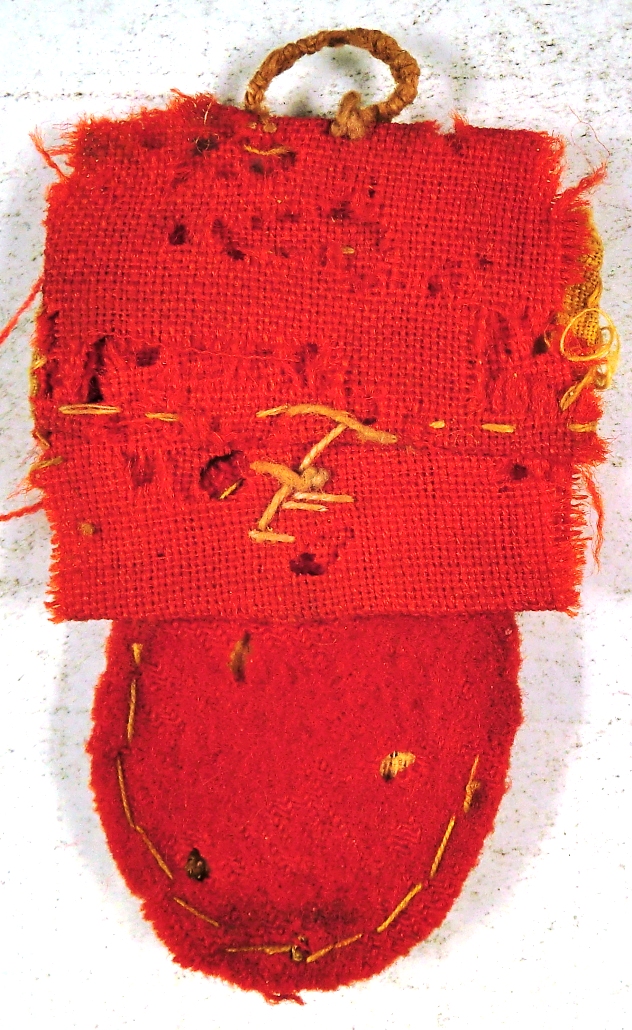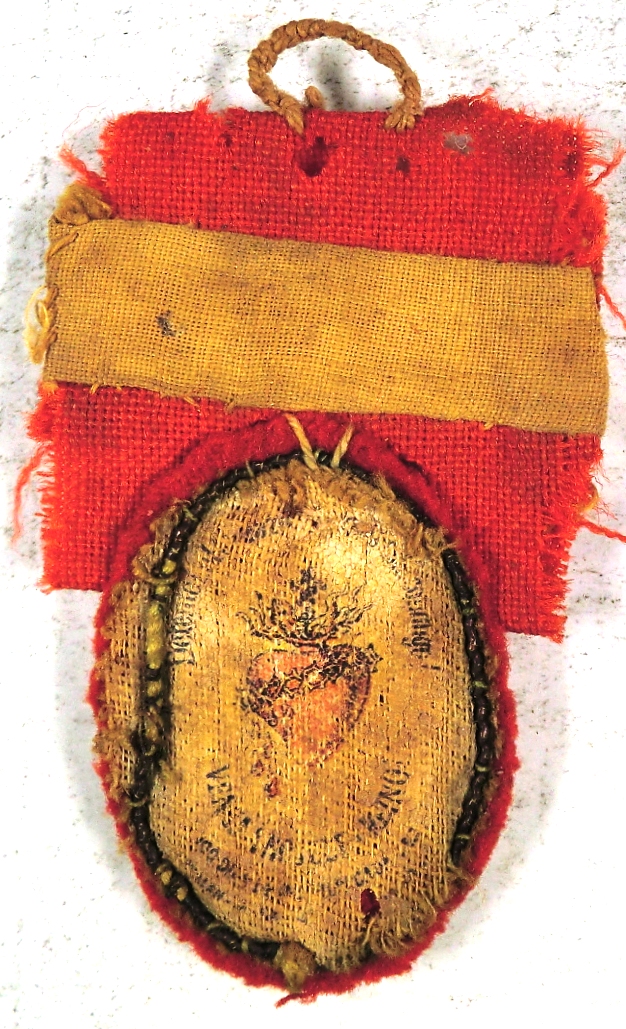 Resumen: Medalla de protección en tela de arpillera de forma ovalada, un corazón rodeado de espinas y en la orla la inscripción: "Detente. El corazón de Jesús está conmigo. Reinaré en España" . Prendida de la bandera nacional. Los detentes los llevaban los combatientes, especilamente carlistas, junto al corazón.