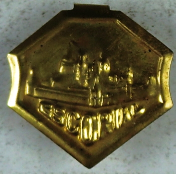 Resumen: Insignia del Auxilio Social. Metal en latón dorado 3 x 4 cm. Grabada a troquel va la silueta de un monasterio y la palabra Escorial.
