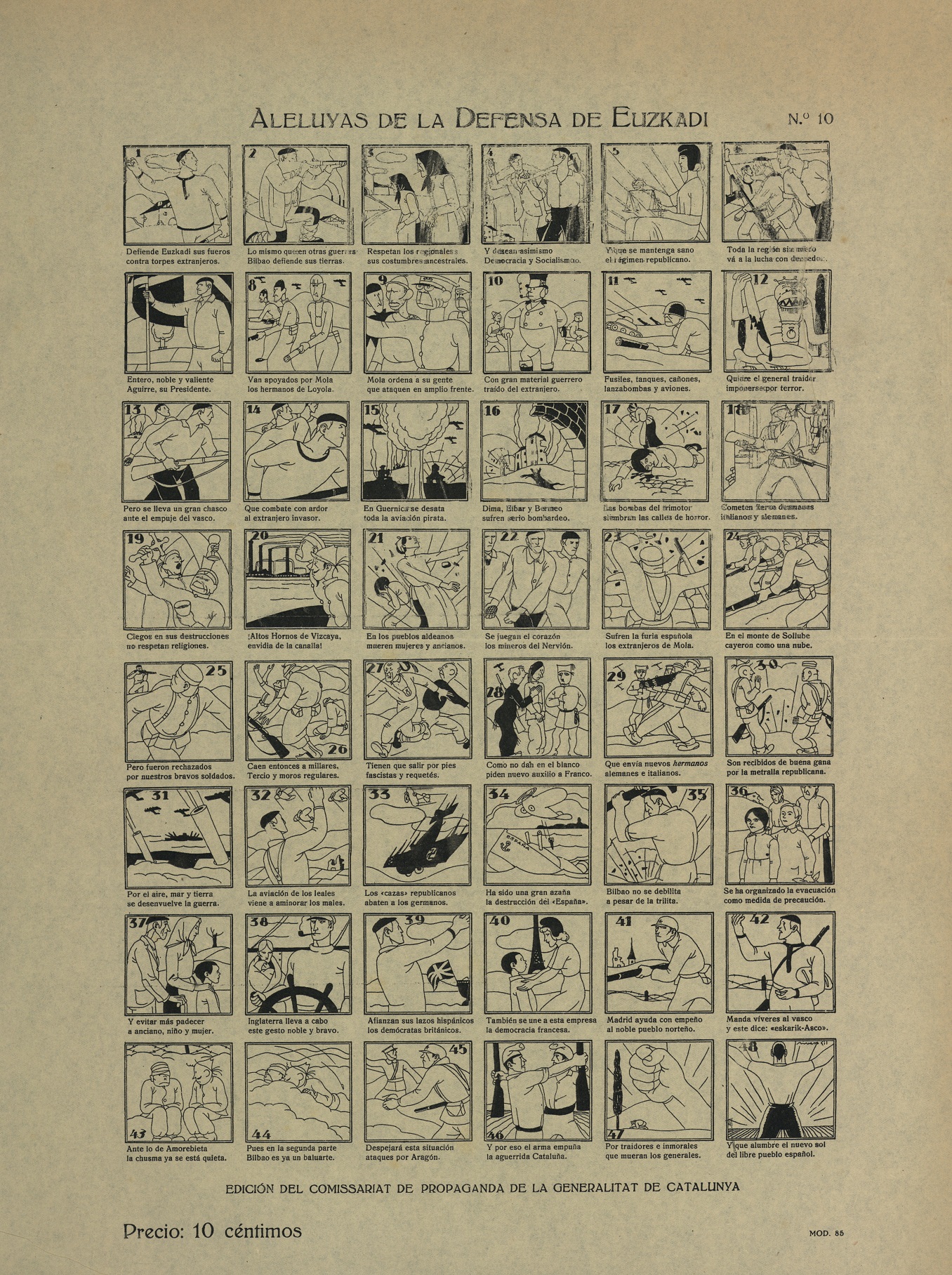 Aleluya editada por la Generalitat de Catalunya formando parte de una serie, de la que hace el número 10, y comercializada al precio de 10 pesetas. Por los textos de las viñetas, su ejecución es anterior a la toma de Bilbao por las tropas franquistas, hecho que tuvo lugar en junio de 1937. |