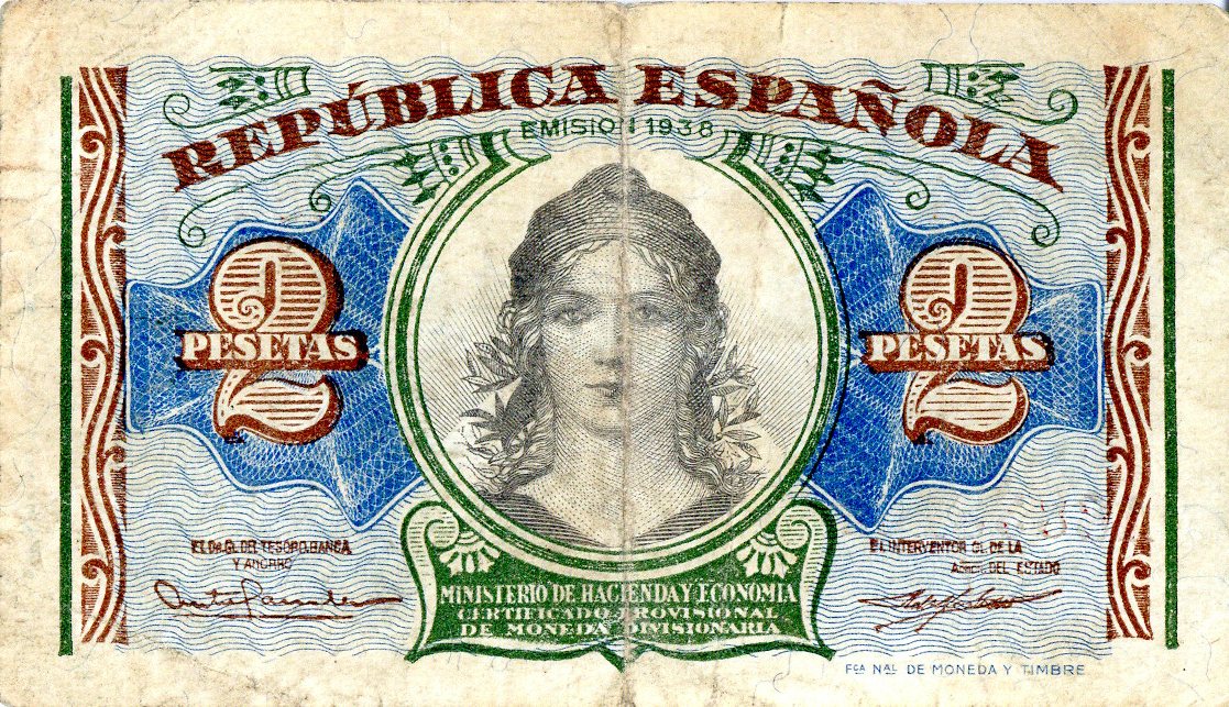 Deskribapena: Certificado provisional de moneda divisionaria, de 2 pesetas, del Ministerio de Hacienda y Economía, emisión de 1938, durante la Segunda República. 2 ejemplares. Nº serie: A8833167 y A5262368.