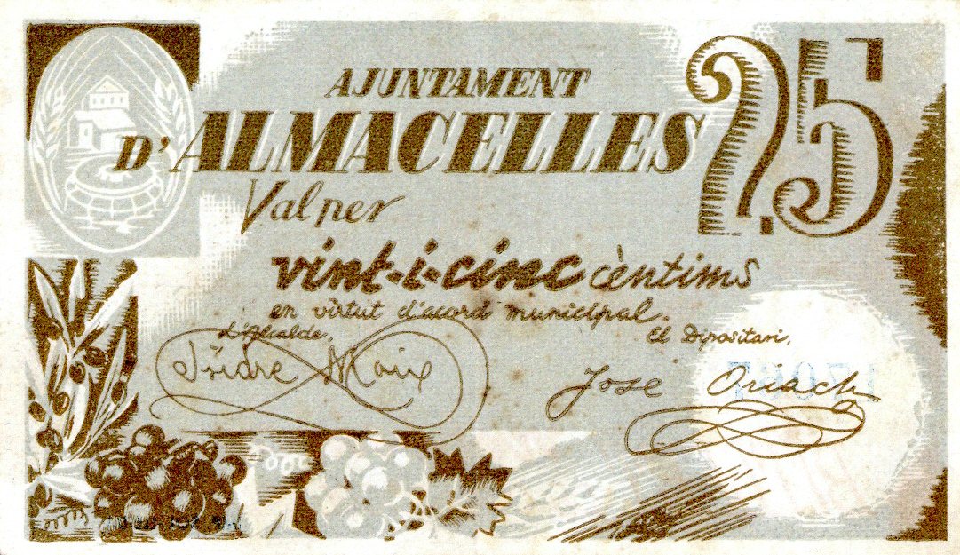 Deskribapena: Vale de 25 céntimos emitido por el Ajuntament de Almacelles en octubre de 1937. Nº serie: 17068. En el reverso: billet de curs local obligatori.