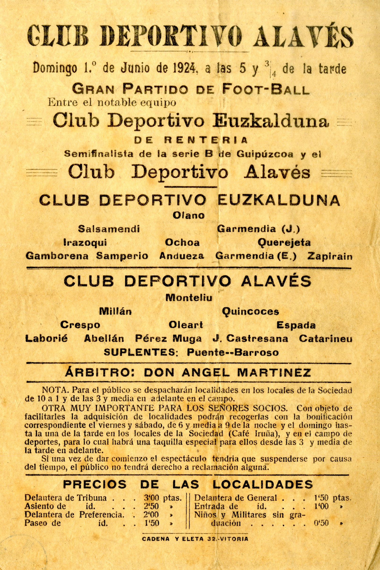 | Izenburua: | Club Deportivo Alavés [Material gráfico] : gran partido de foot-ball entre el notable equipo Club Deportivo Euzkalduna de Rentería semifinalista de la serie B de Guipúzcoa y el Club Deportivo Alavés : domingo 1o. de junio de 1924, a las 5 y 3/4 de la tarde.. |