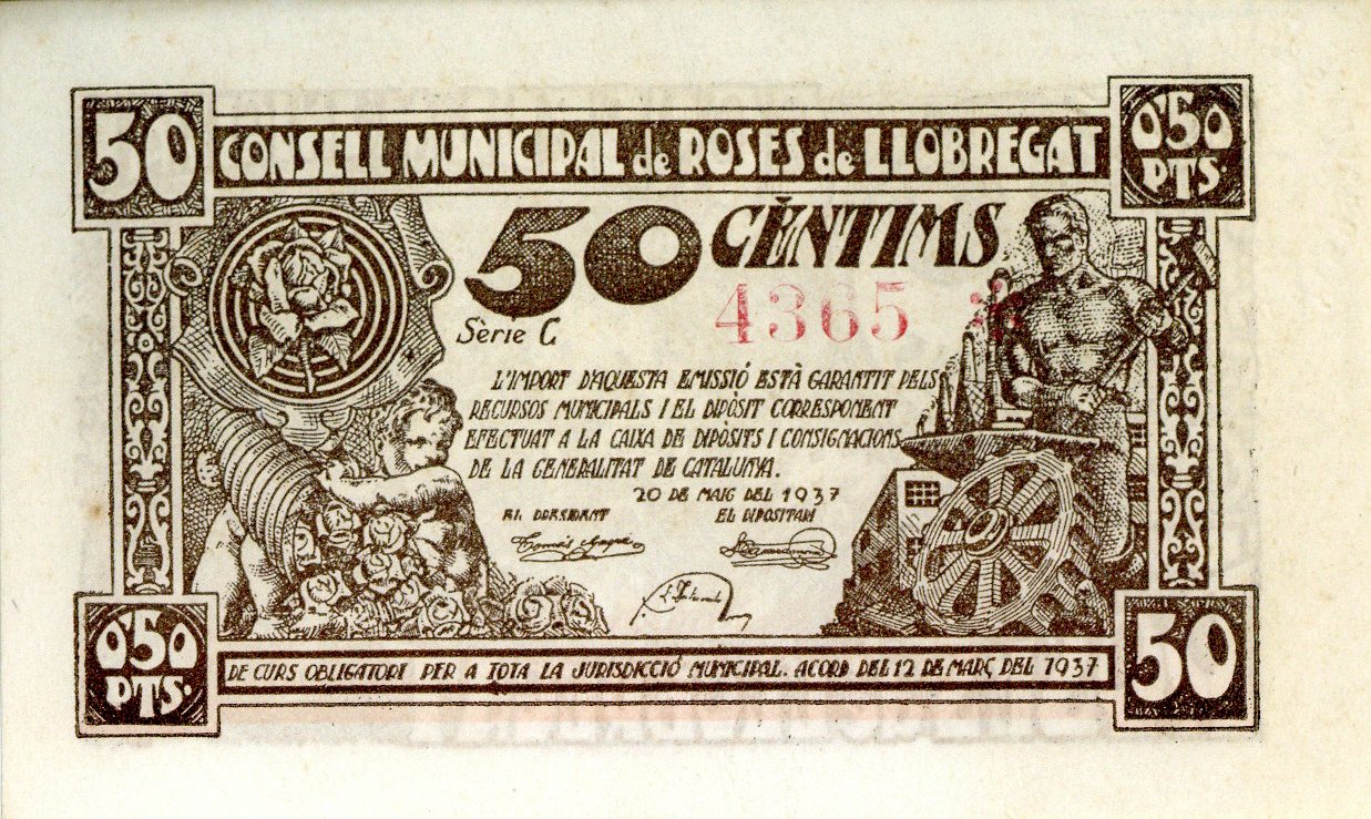 Resumen: Billete emitido por el Consell Municipal de Roses de Llobregat el 20 de mayo de 1937. N. de serie: 4365 Serie C.