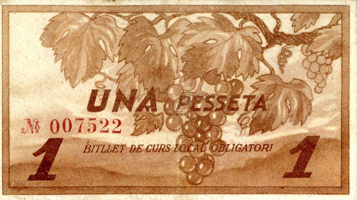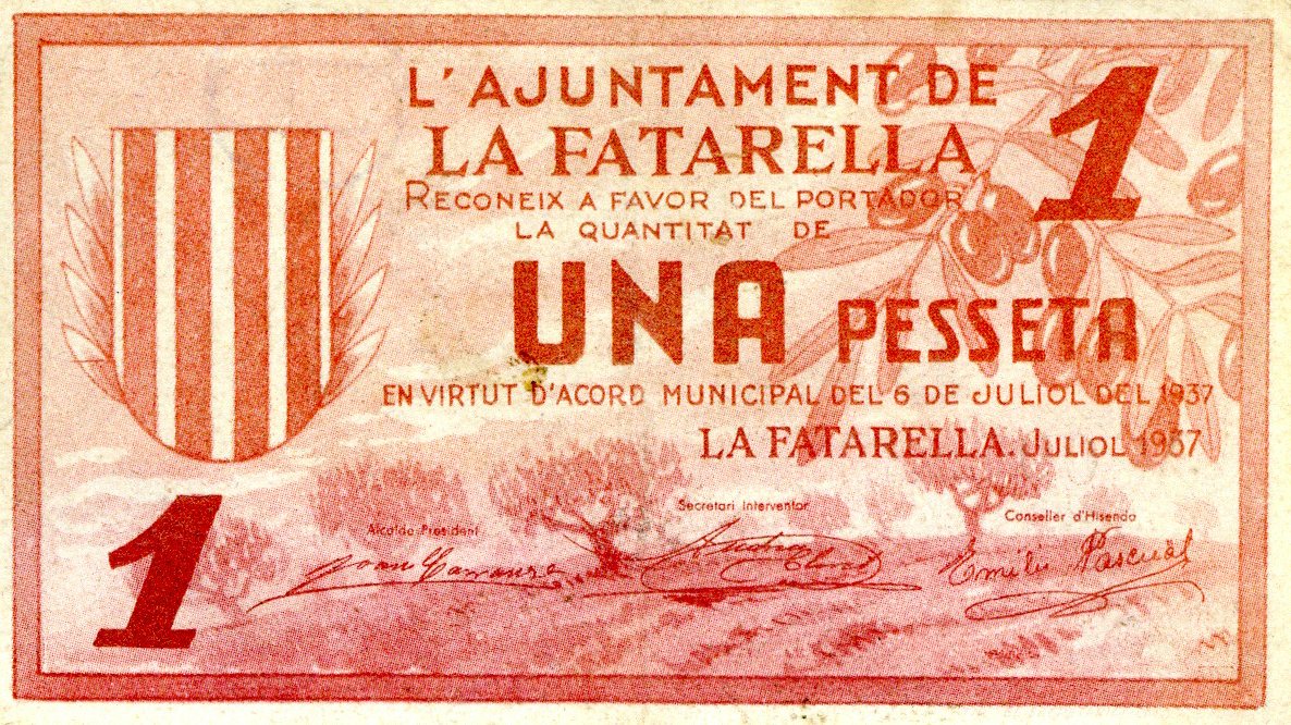 Deskribapena: Billete emitido por el Ayuntamiento de La Fatarella en julio de 1937. N. serie: 007522.