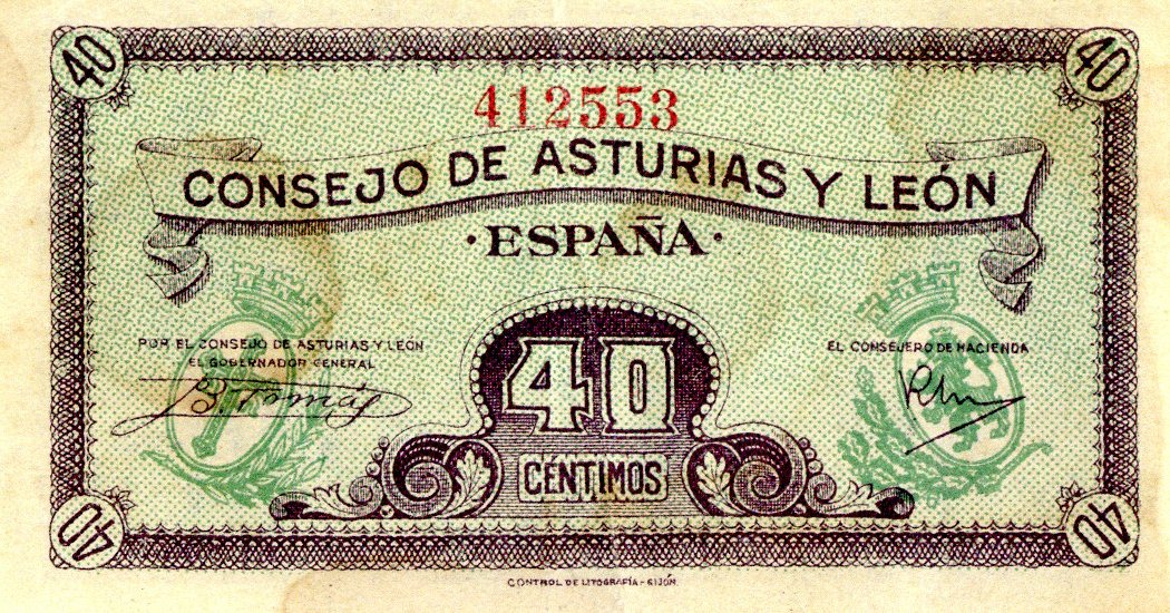 Resumen: Billete emitido por el Consejo de Asturias y León. 40 céntimos. S. f. Nº serie: 412553