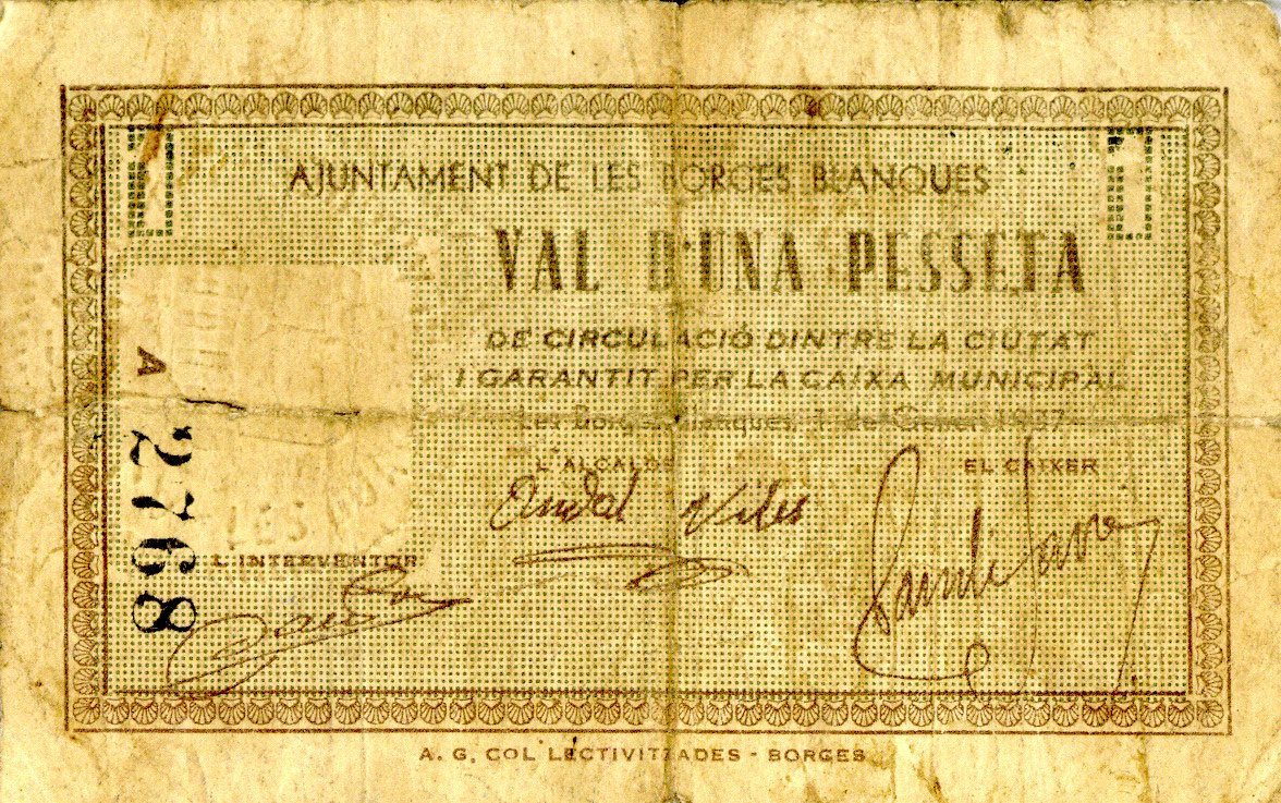 Resumen: Vale emitido por el Ajuntament de Les Borges Blanques. 1 peseta.1937. Nº serie: A 2768. En mal estado.