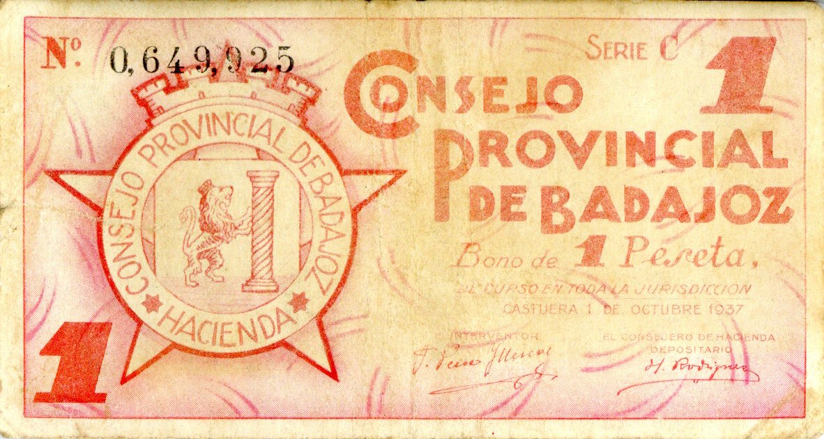 Deskribapena: Bono emitido por el Consejo Provincial de Badajoz. 1 peseta. 1937. Nº serie: 0,649,925 Serie C.