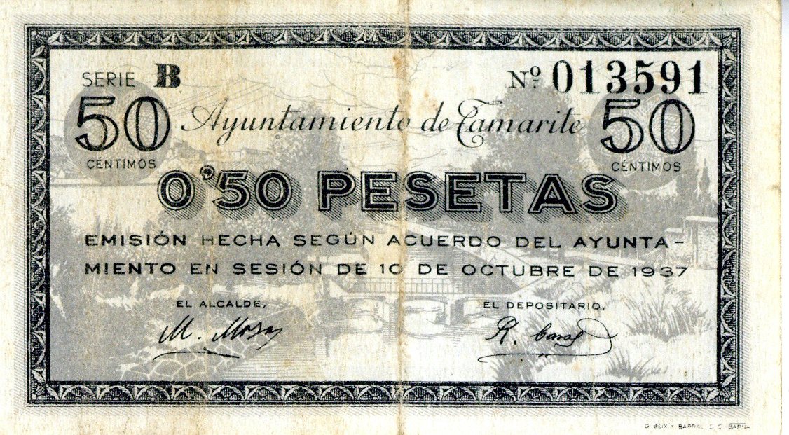 Resumen: Billete emitido por el Ayuntamiento de Tamarite. 50 céntimos. 1937. Nº serie 013591 Serie B.