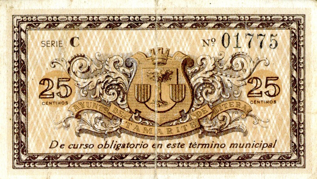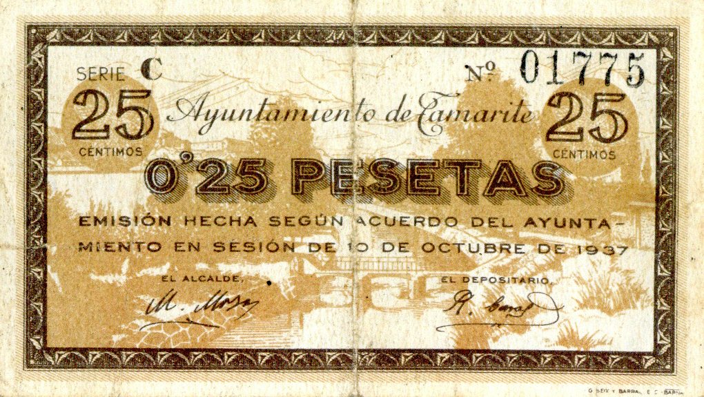 Resumen: Billete emitido por el Ayuntamiento de Tamarite. 25 céntimos. 1937. Nº serie: 01775 Serie C.