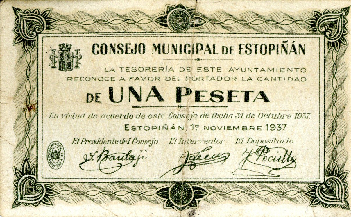 Deskribapena: Billete emitido por el Consejo Municipal de Estopiñán. 1 peseta. 1937. Nº serie: 0437.