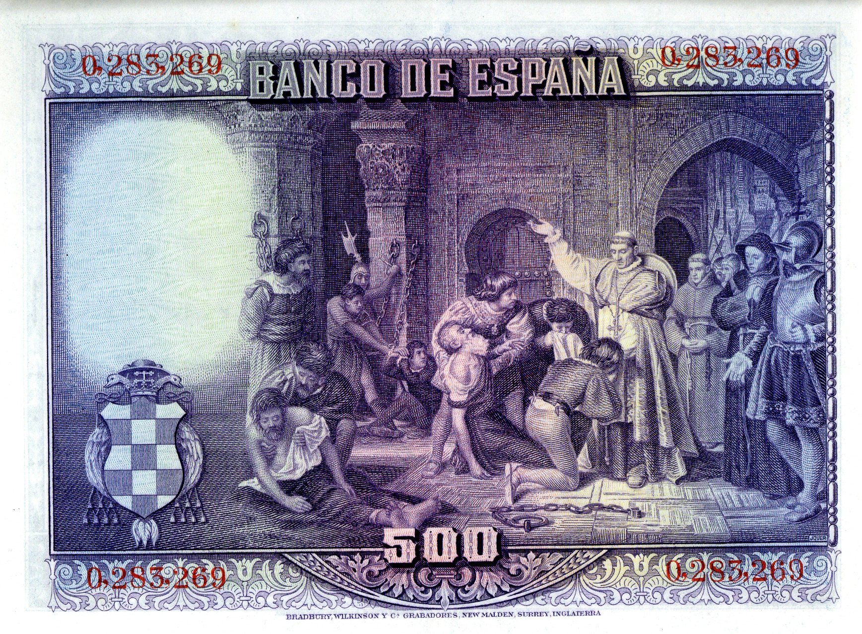 Resumen: Billete de quinientas pesetas emitido por el Banco de España el 15 de agosto de 1928 (a pesar de que fue encargado y fabricado bajo el reinado de Alfonso XIII, comenzó a circular cuando ya estaba instaurada en España la II República). Fabricado en tipografía y calcografía por la casa "Bradbury" de Londres. En el anverso aparece la cabeza de Francisco Jiménez de Cisneros ( Cardenal Cisneros ) y una vista de la Catedral de Alcalá de Henares (Madrid). En el reverso se muestra el cuadro de Francisco Jover Casanova "Liberación de los cautivos de Túnez". La marca al agua es una cabeza masculina de la época de Cisneros. Nº serie: 0,283,269.